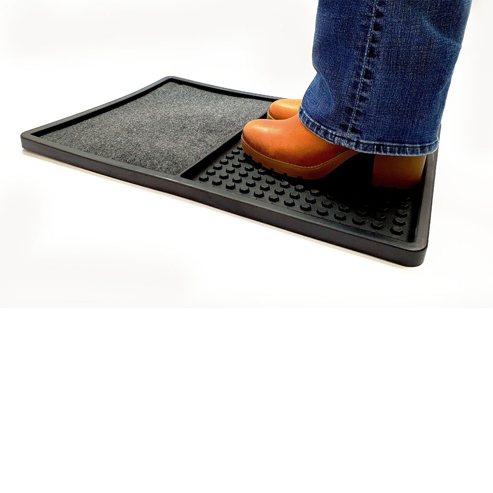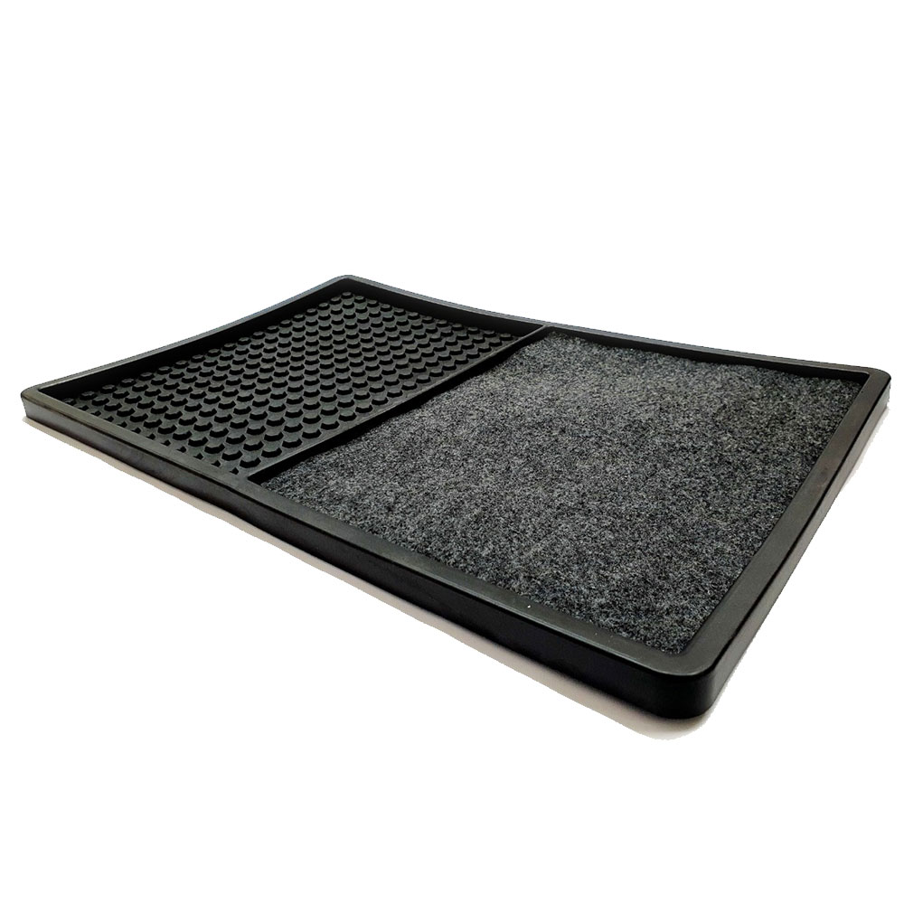 Excelente tapete ideal para eliminar los virus y bacterias que el calzado recoge del suelo así como cualquier otro contaminante ya que este tapete es capaz de albergar hasta 4 litros de solución desinfectante en su interior que junto a las costillas limpiadoras de hule lograrán raspar y desinfectar los contaminantes en tu calzado.